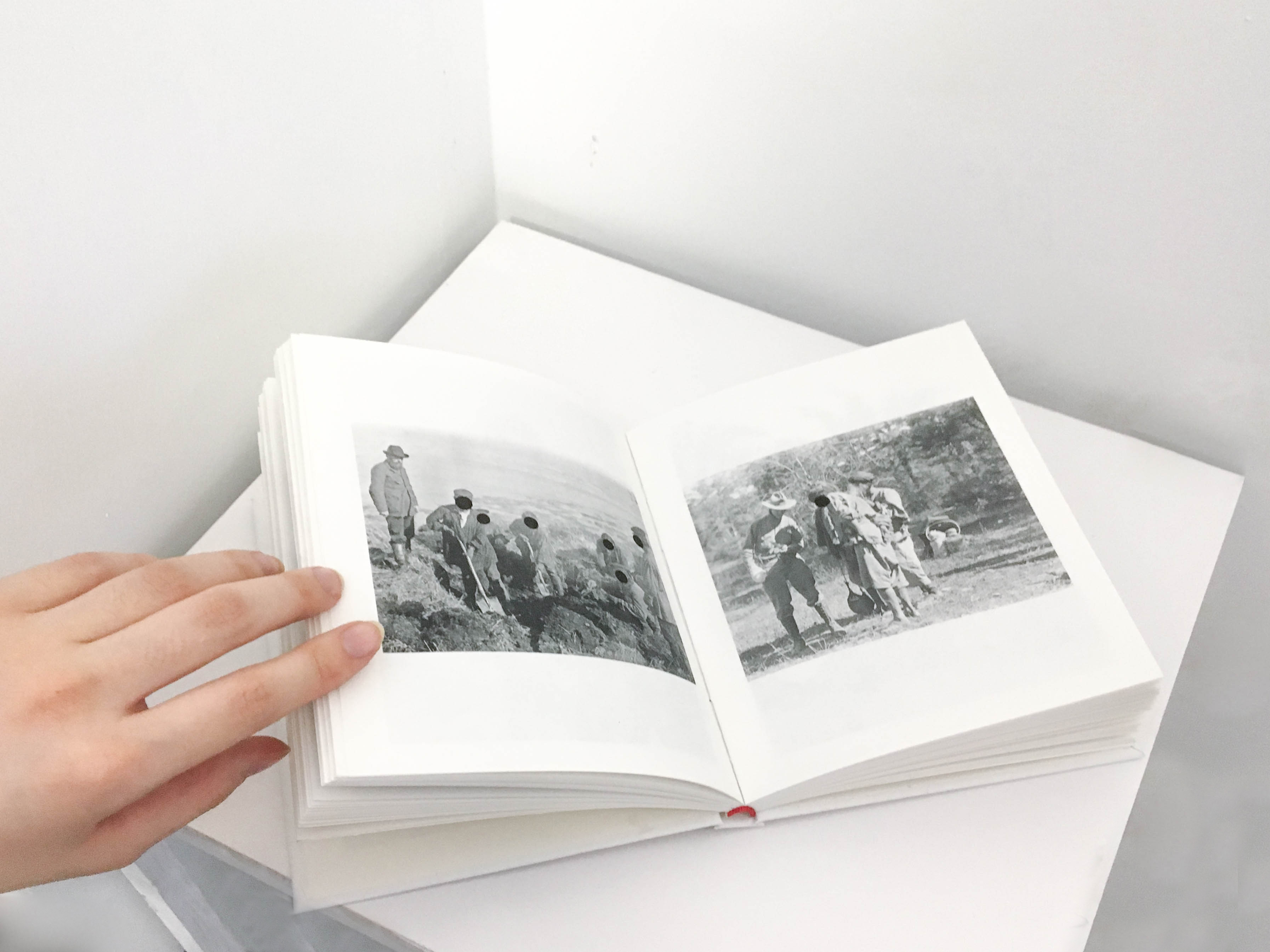 // The touchable book filled with portraits of expeditioners and researchers funded by the American Museum of Natural History. Due to some of these photos including the faces of local guides or other individuals not affiliated with the museum there are black circles throughout the book that censor these people’s faces.