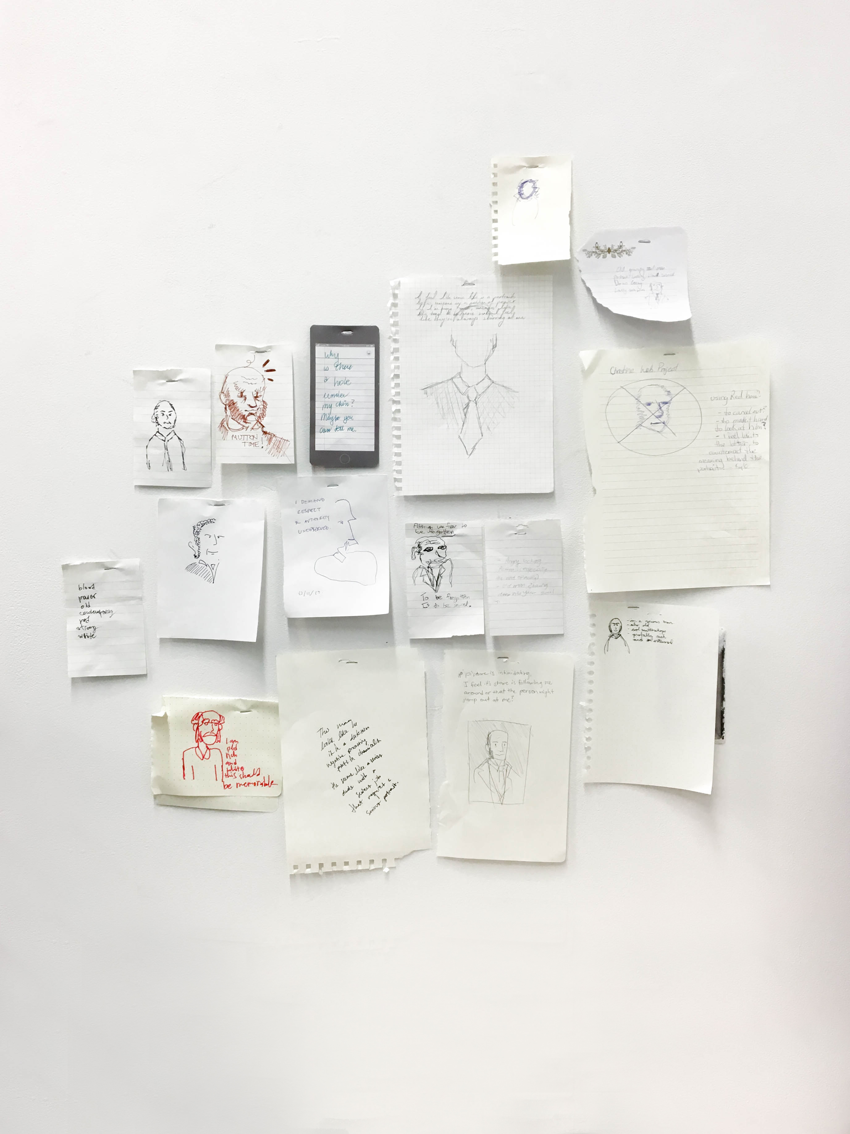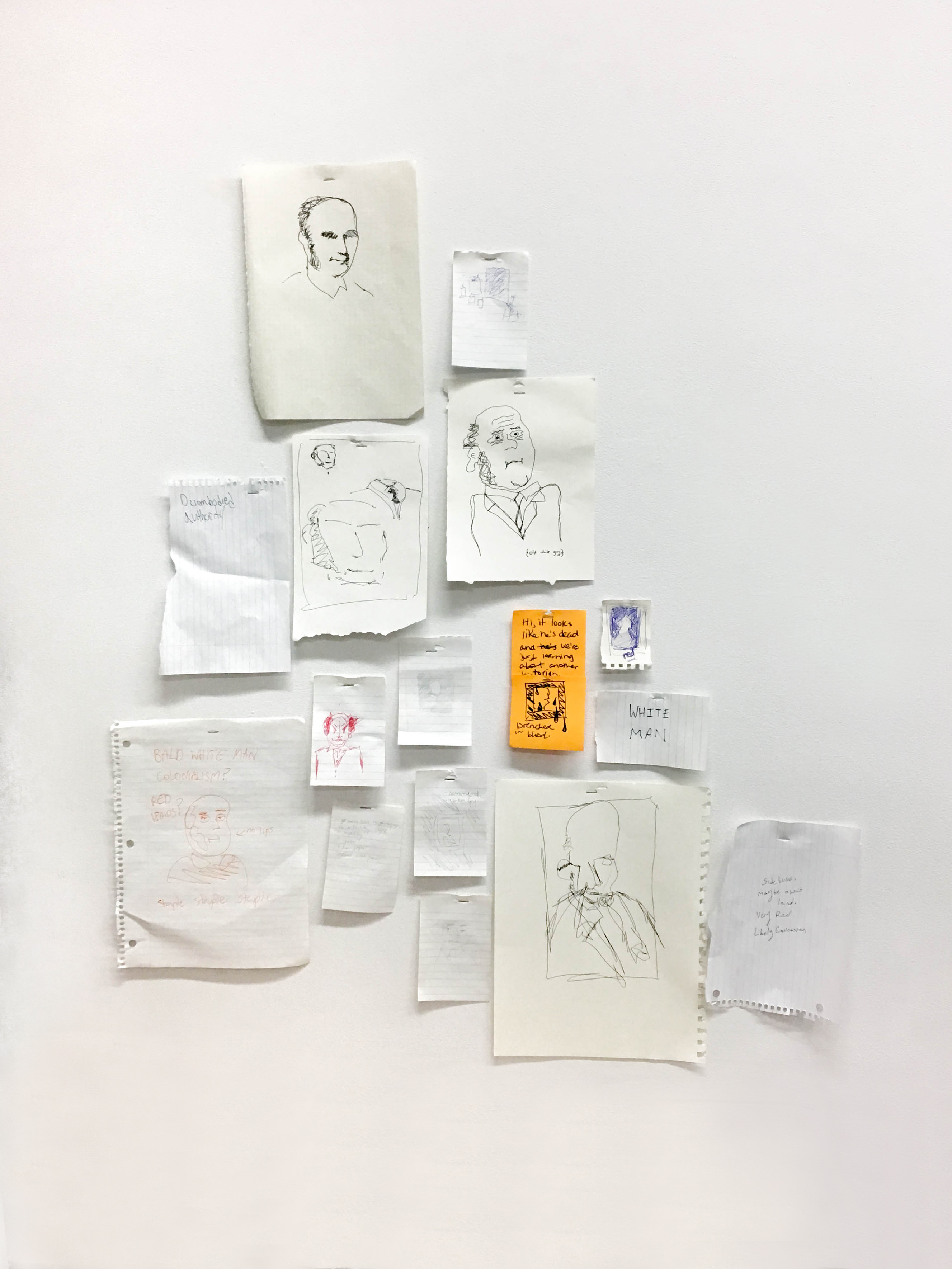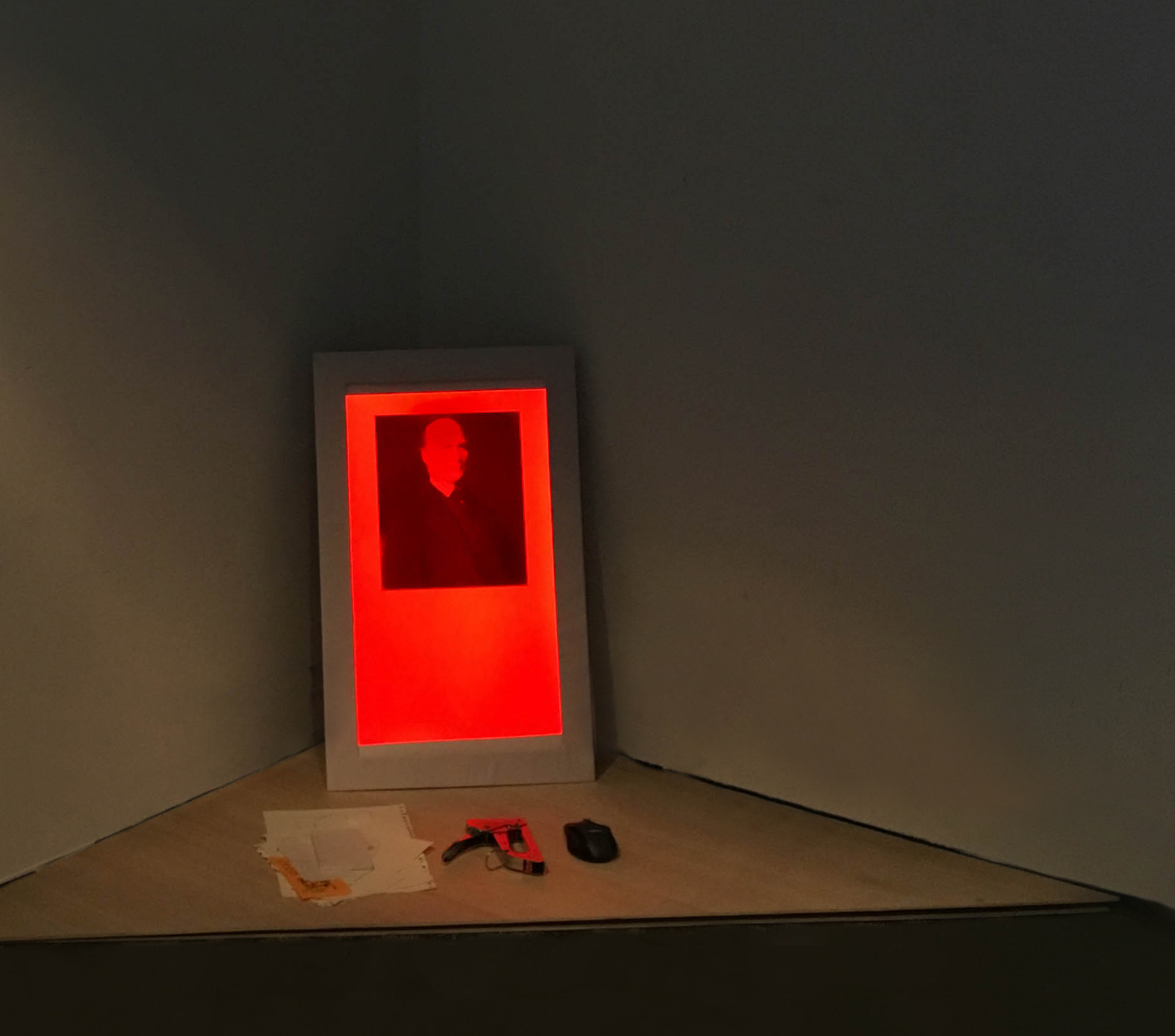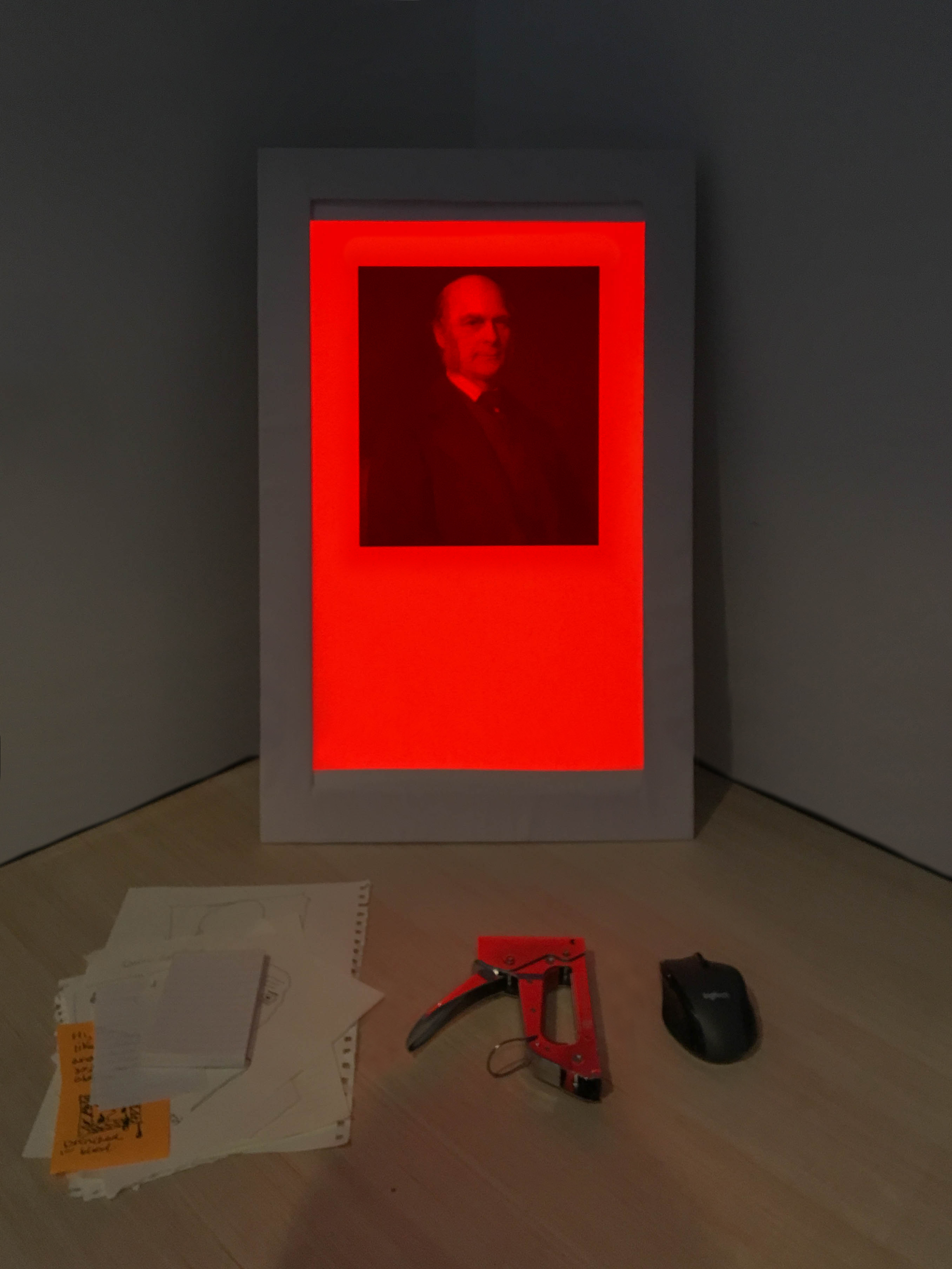 // The installation before the performance began—in front of the portrait of Francis Galton are a pile of previous audience contributions, a staple gun, and a computer mouse.