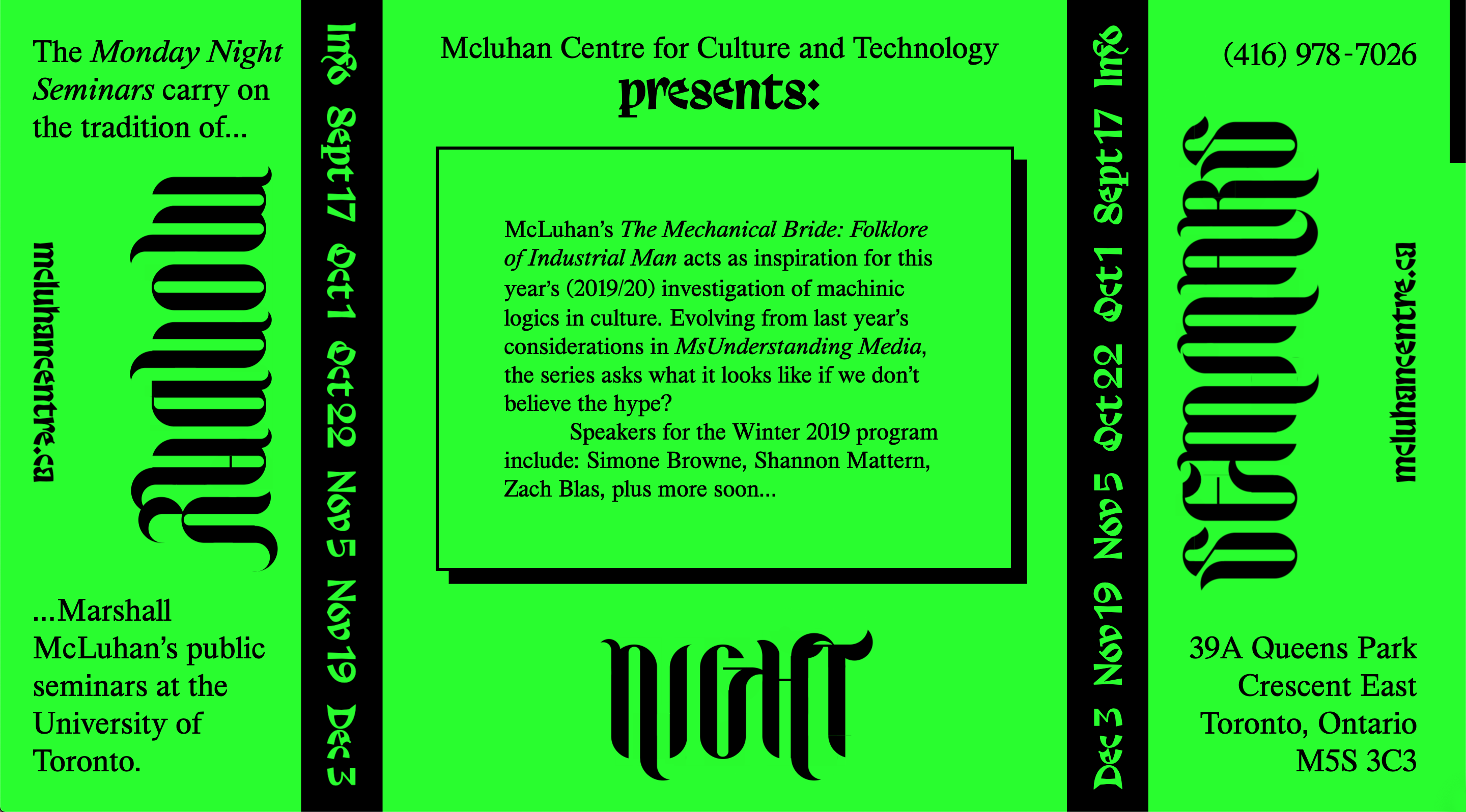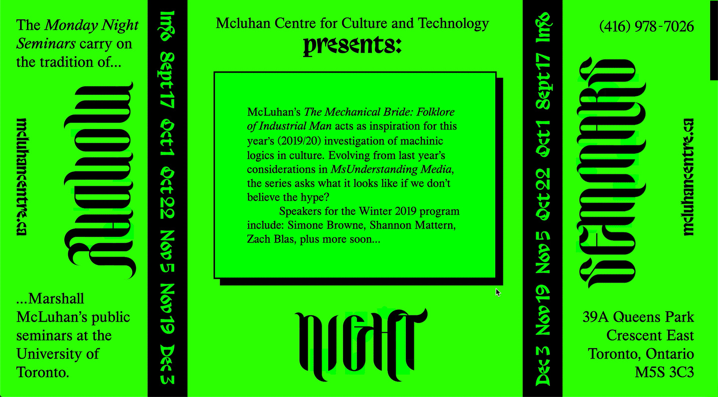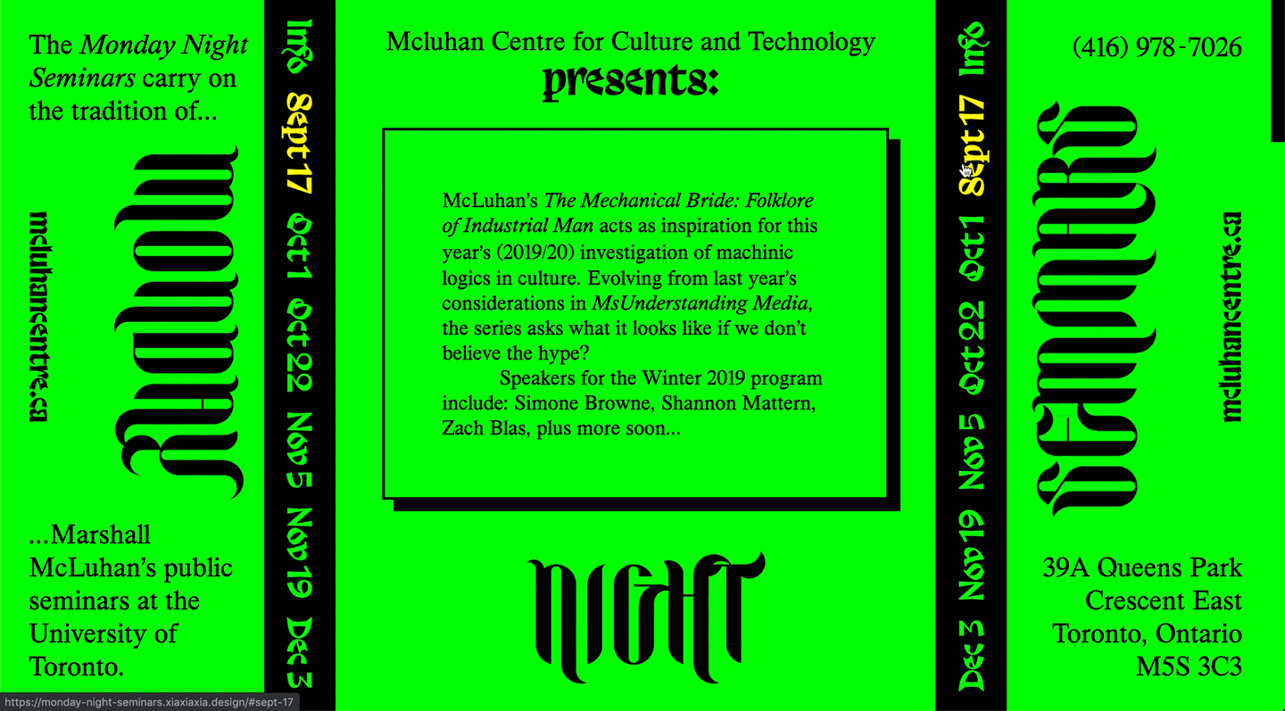// Details on the speakers are hidden until the user hovers over them and the large titles that say ‘Monday Night Seminars’ expand and deteriorate, revealing how the letterforms were made.