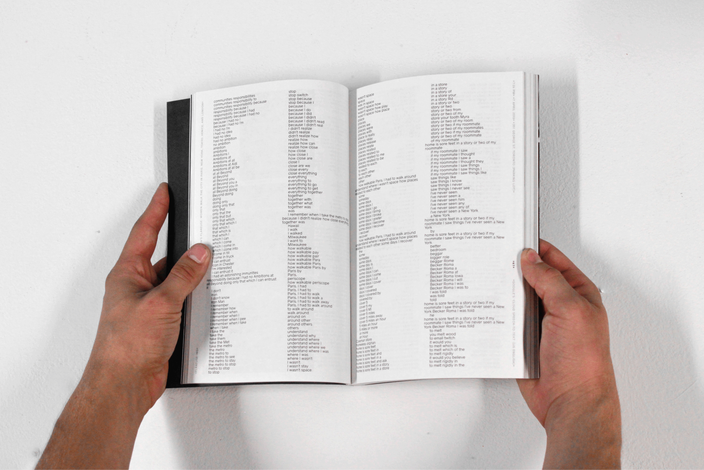 // 183-page book of recorded speech-to-text and video stills from We have only just met (Scene 1).